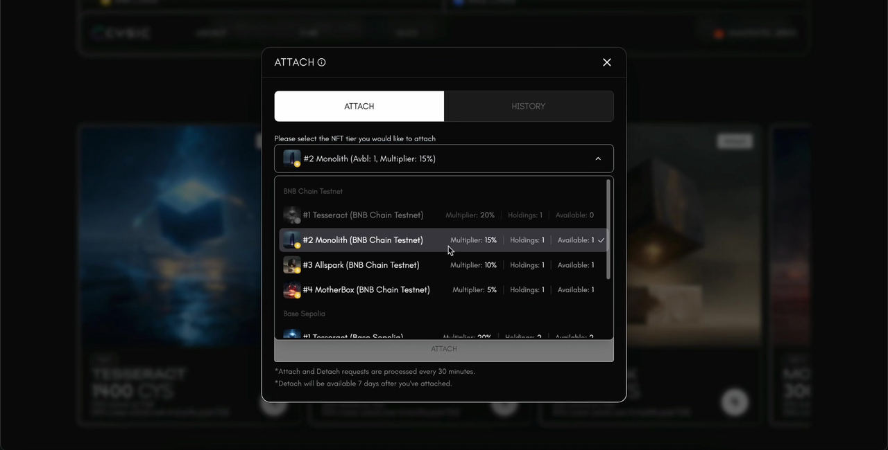 An ATTACH dialog will appear. Click the dropdown to select the NFT tier you would like to attach.The dropdown lists all your NFTs across supported chains (BNB Chain and Base Chain), showing: