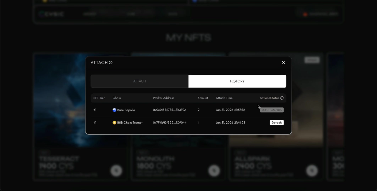 Q: Can I attach NFTs from different chains to the same worker? A: Yes. You can attach NFTs from both BNB Chain and Base Chain to the same worker address. Each attachment is tracked separately in the History tab.