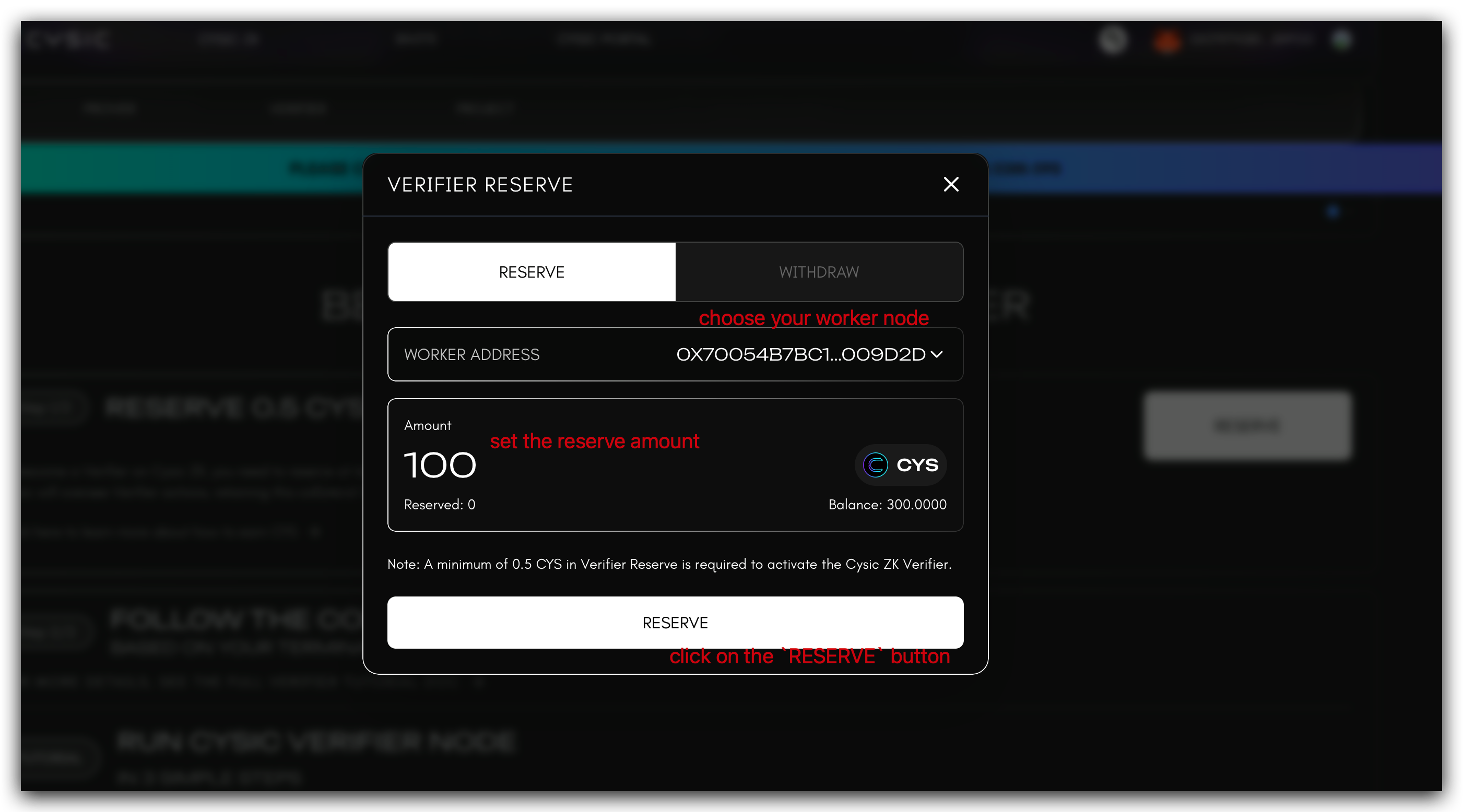 Reserve CYS Tokens: Scroll to the RESERVE CYS section, click the RESERVE button, select your worker node from the dropdown menu, and specify the required amount of CYS tokens to reserve.